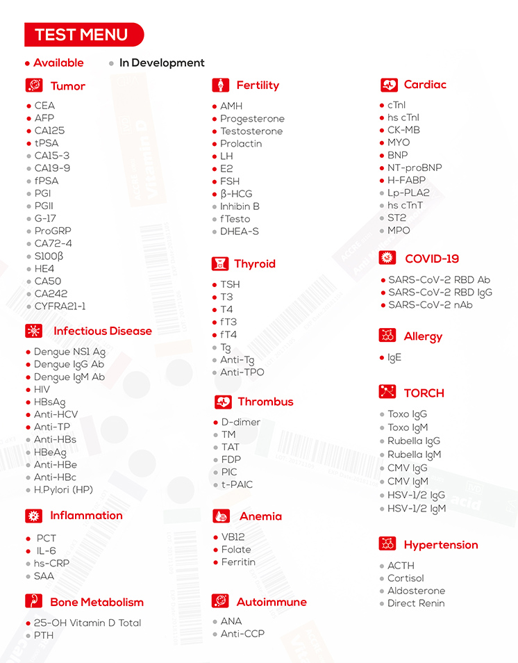 Accre 8 es un analizador automático compacto de inmunoensayo por quimioluminiscencia (CLIA) de sobremesa. Con cartucho de reactivo de monodosis, puede funcionar 600 días sin fallos (tiempo medio entre fallos, MTBF), sin necesidad de consumibles adicionales. Disfruta tanto de un funcionamiento sencillo como de un sistema fiable de calibración y control de calidad.